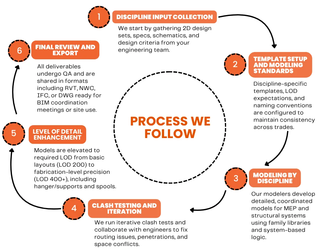 All deliverables undergo QA and are shared in formats including RVT, NWC, IFC, or DWG ready for BIM coordination meetings or site use.