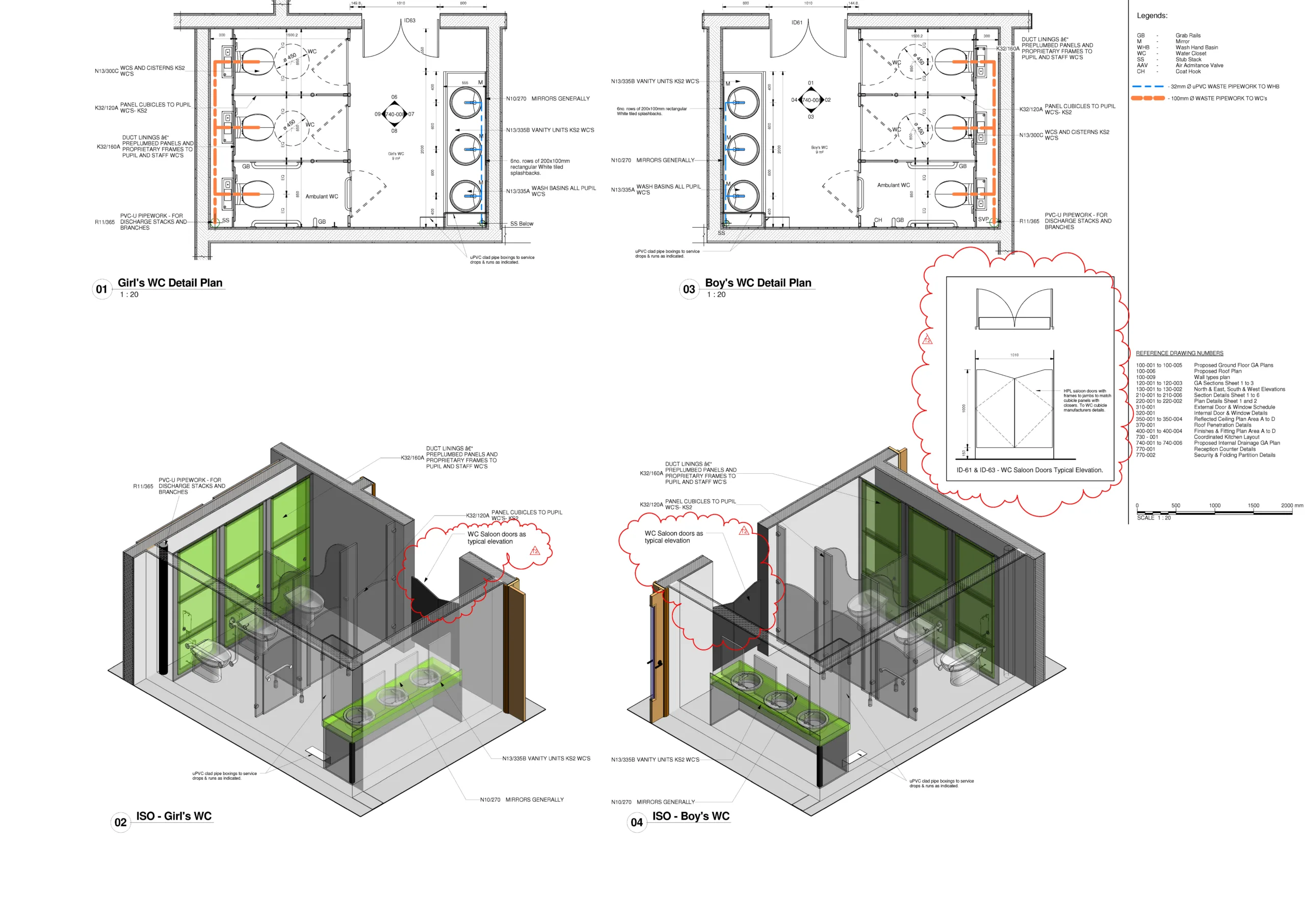 We create full sheet sets including GA plans, reflected ceiling plans, enlarged details, isometric views, and component callouts.