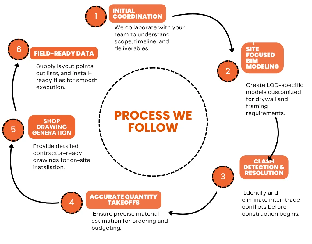 As a trusted BIM Services Provider Company in the USA, UK, Europe and Middle East, we help construction teams execute drywall and framing scopes more efficiently—backed by intelligent planning, clash-free coordination, and material optimization.